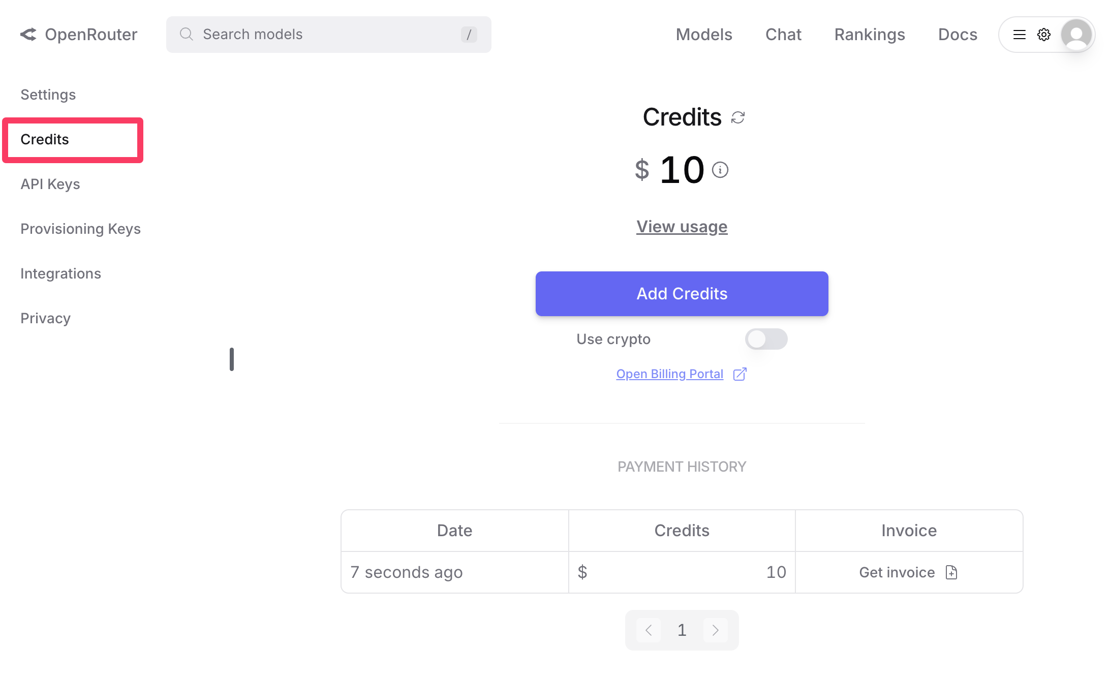 ただし有料なので、利用するにはOpenRouterのクレジットをチャージしておく必要がある。