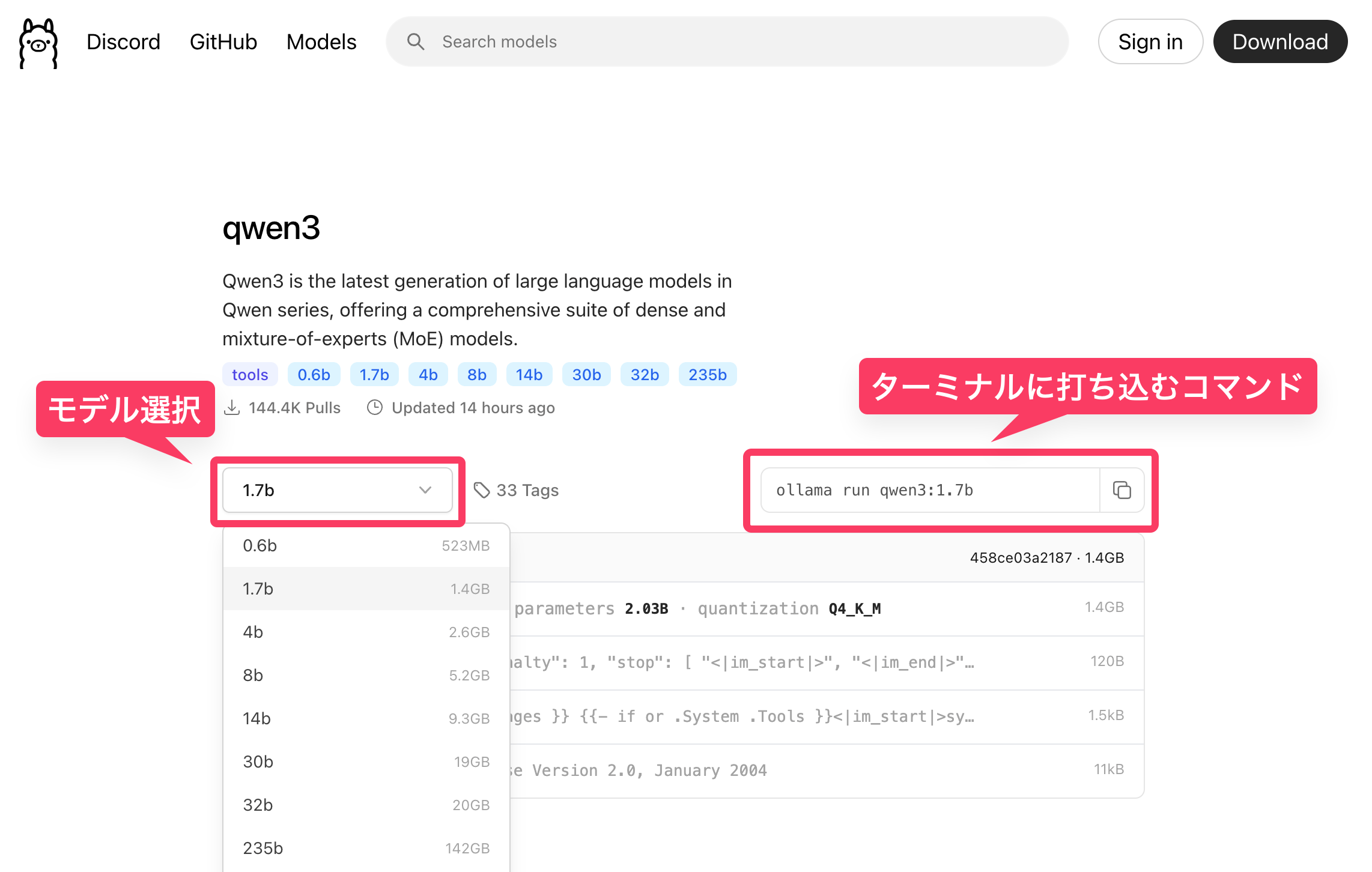 Ollama公式サイトのモデル一覧から、利用したいモデルをプルダウンで選択すると、コマンドライン上で打ち込むべきコマンドが表示されるので、それをそのままコピペする。