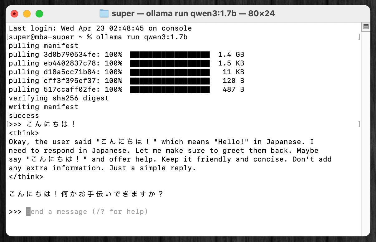ターミナルで、ollama run qwen3:1.7bというコマンドを打ち込むだけで、モデルがローカル環境にダウンロードされ、さらにそのままチャットを開始できる。