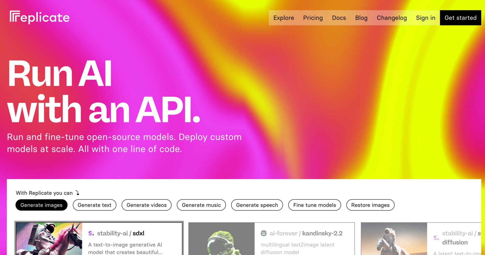 Replicateでは、自分のカスタムAIモデルをアップロードして、それをReplicateが提供するクラウドGPUマシン上で動かすことも可能だが、他の人が公開しているモデルを利用するのが中心になる。