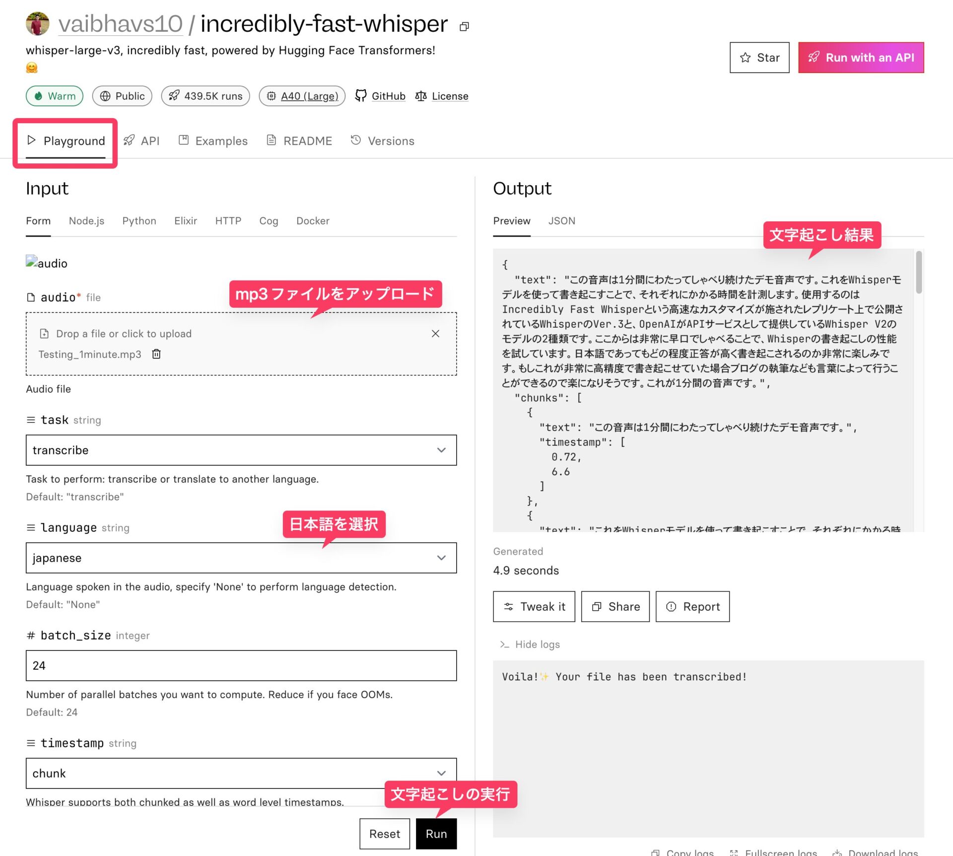 先ほどと同じく、1分間の音声ファイルをアップロードして、言語を日本語に設定し、「Run」ボタンを押してみる。