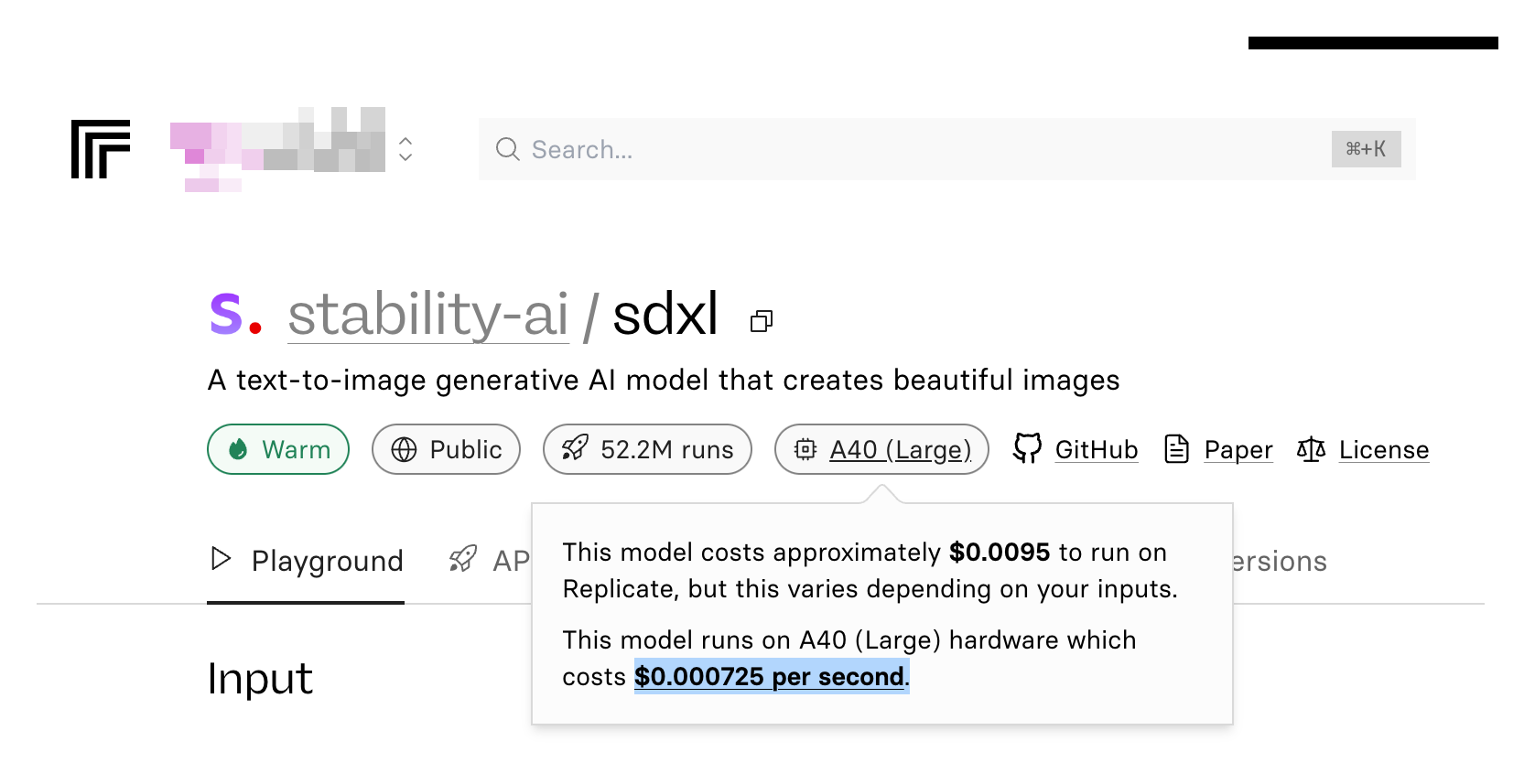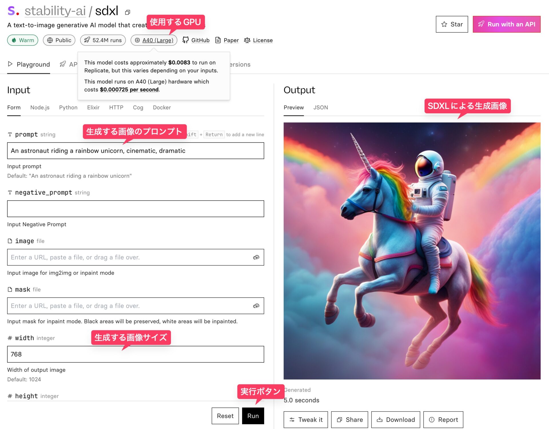 stability-ai/sdxlで使用されているGPUは、上で紹介したIncredibly-Fast-Whisperと同じNVIDIA A40 (Large)なので、画像生成にかかる時間1秒につき0.000725ドルを要する。