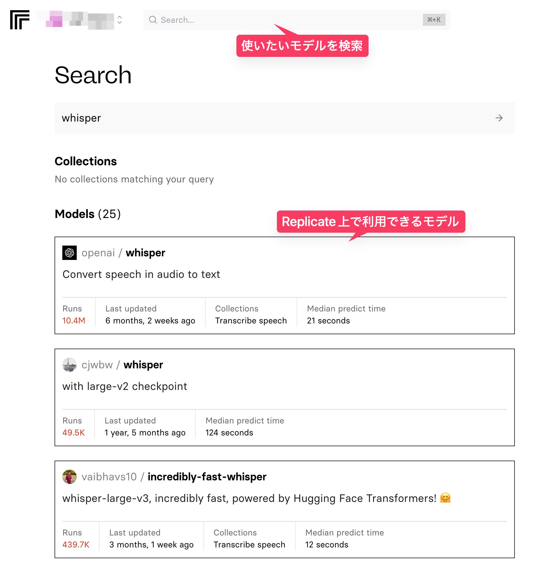 「Whisper」というモデル名で検索をして、OpenAIが公式で提供しているReplicateのWhisper v3モデルにアクセスしてみよう。
