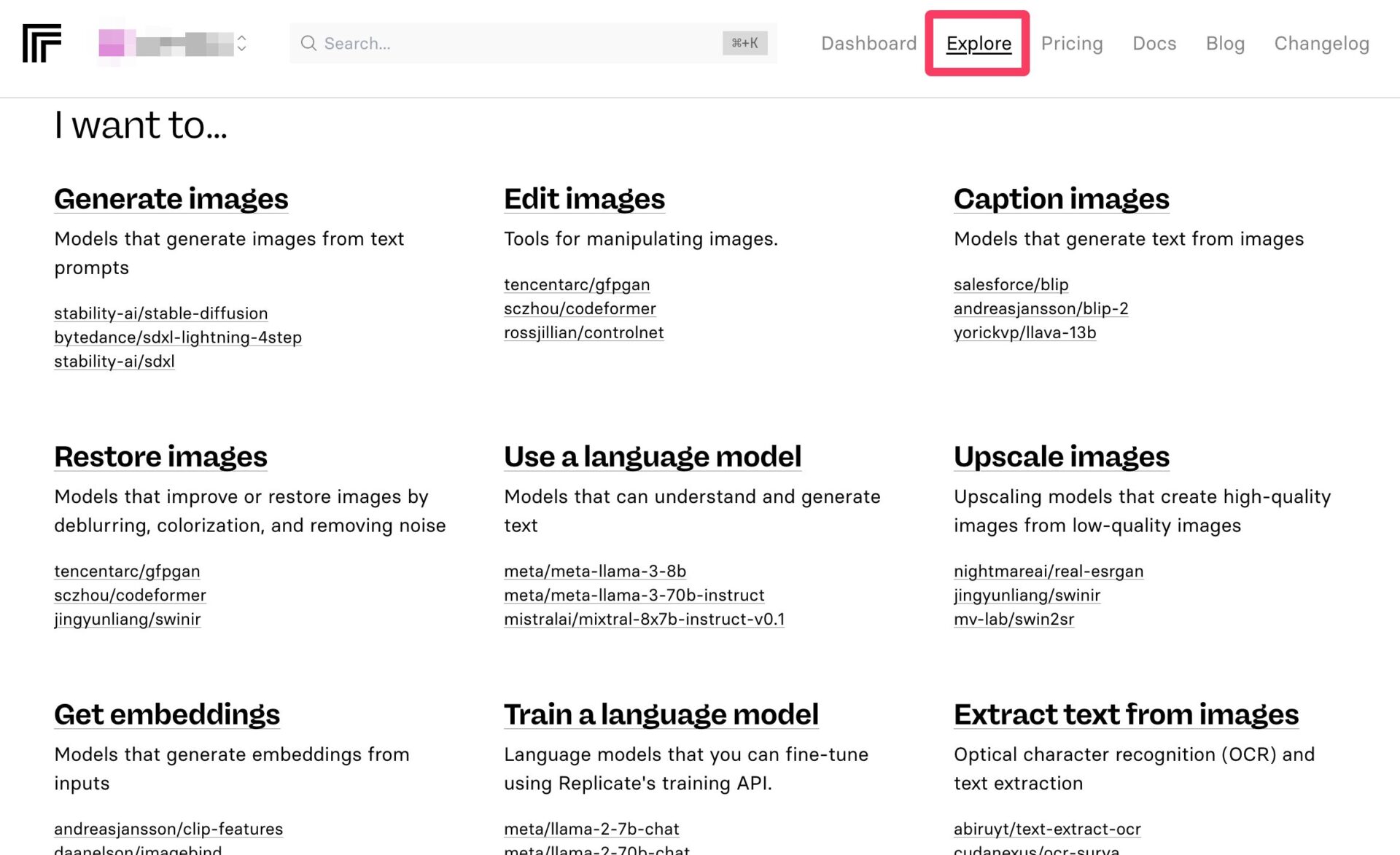 そうしたAIモデルを探すには、「Explore」タブをクリックすると、目的別に整理されたリストを閲覧できる。