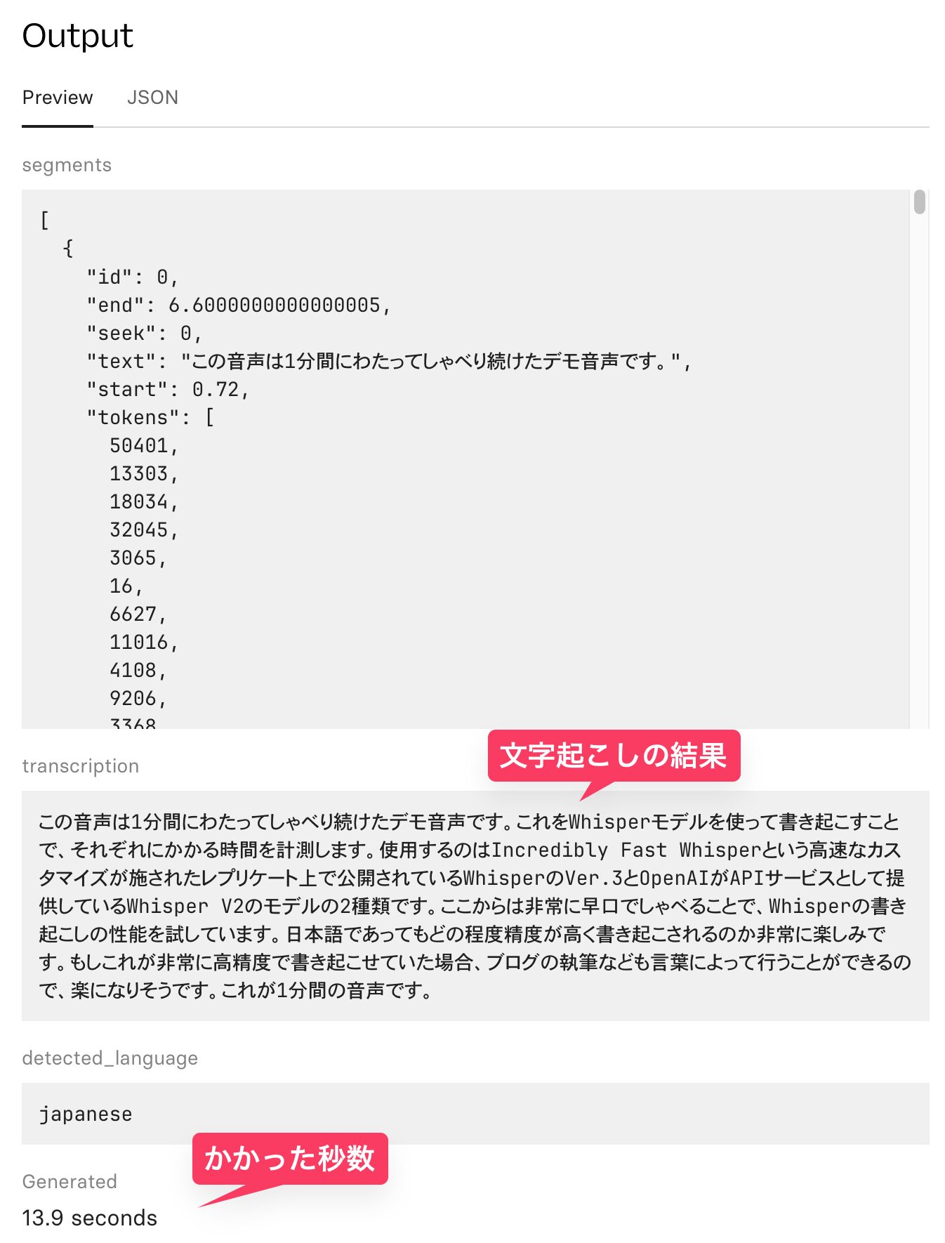 1分間の日本語の音声が、13.9秒で文字起こしされ、聞き間違いなどなく正確にテキスト化されている。英語と日本語が混ざるような文章も、ある程度正確に和文と英文が書き分けられており驚かされる。
