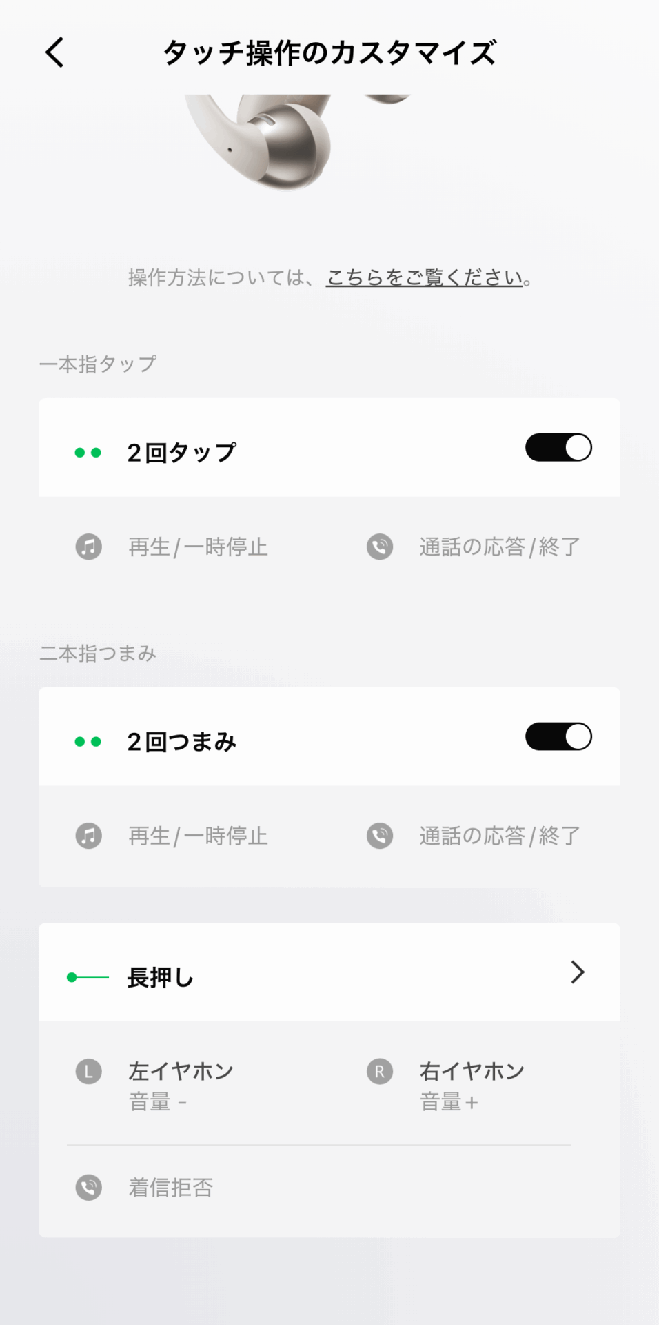 もちろん、タッチコントロールの有効・無効を切り替えることも可能なので、頻繁に耳を触る癖があるなど、誤タッチが怖い人はオフにすることも可能である。