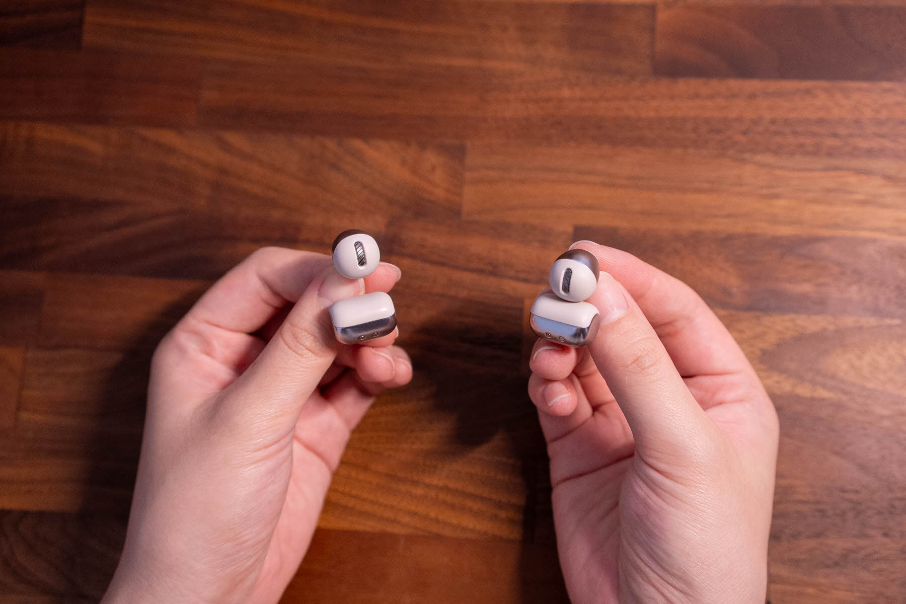 「OpenDots ONE」のようなオープンイヤー型(写真左)と、「AirPods Pro 2」のようなカナル型(写真右)の違いは、耳を密閉するかどうかだ。