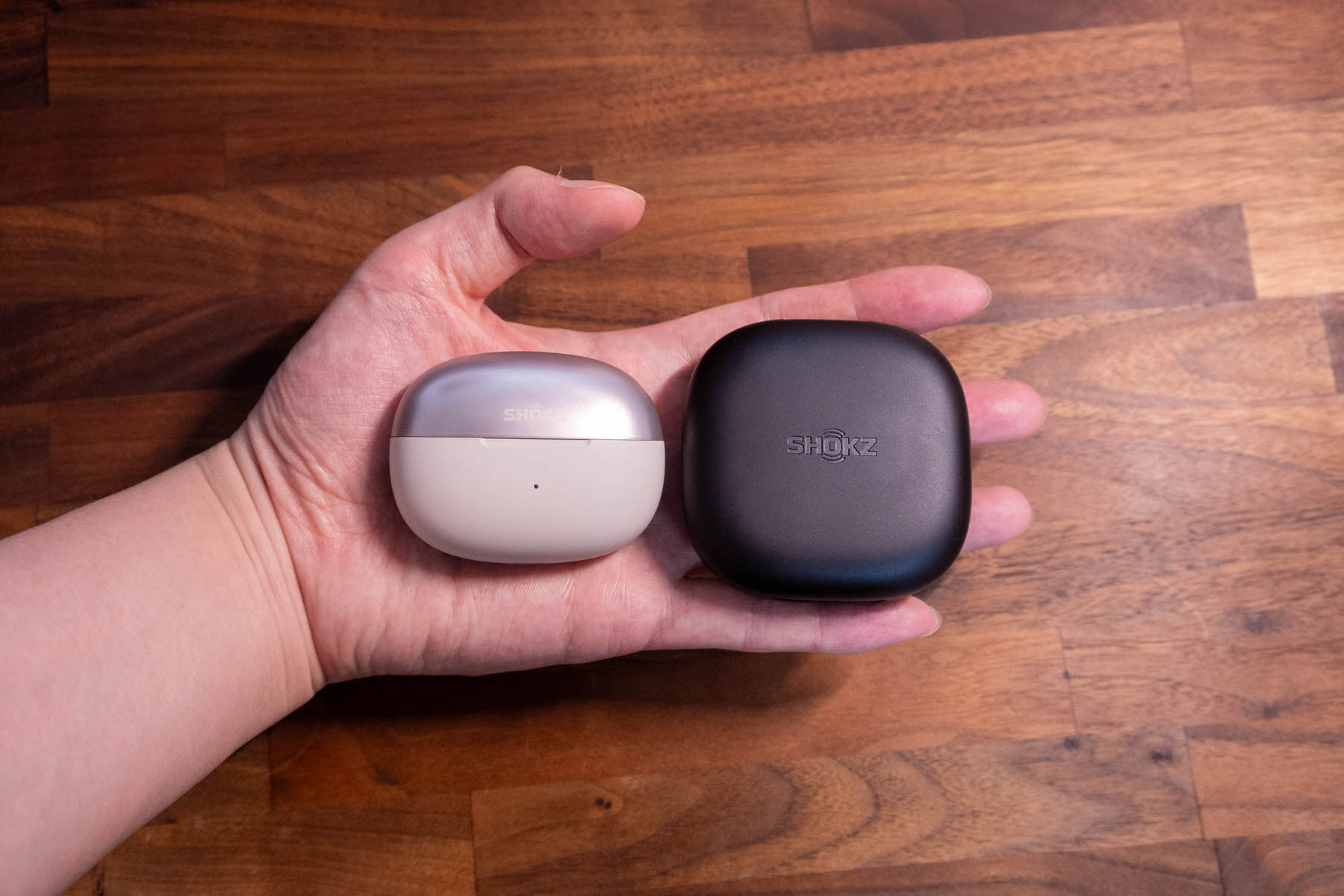 以下は、Shokzのオープンイヤー型イヤホンの「OpenFit 2」と並べてみた様子である。「OpenDots ONE」の方が、全体的に体積が小さく、コンパクトで軽量になっている。