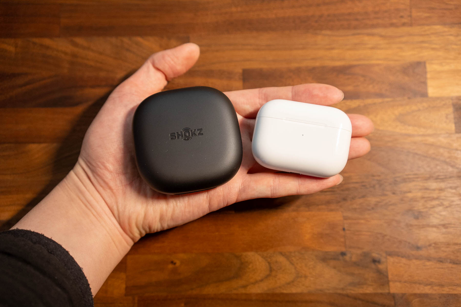 イヤーフックが収まるスペースが必要になるためか、OpenFit 2の充電ケースは、たとえばAirPods Pro 2のケースなどと比べると一回り大きい。