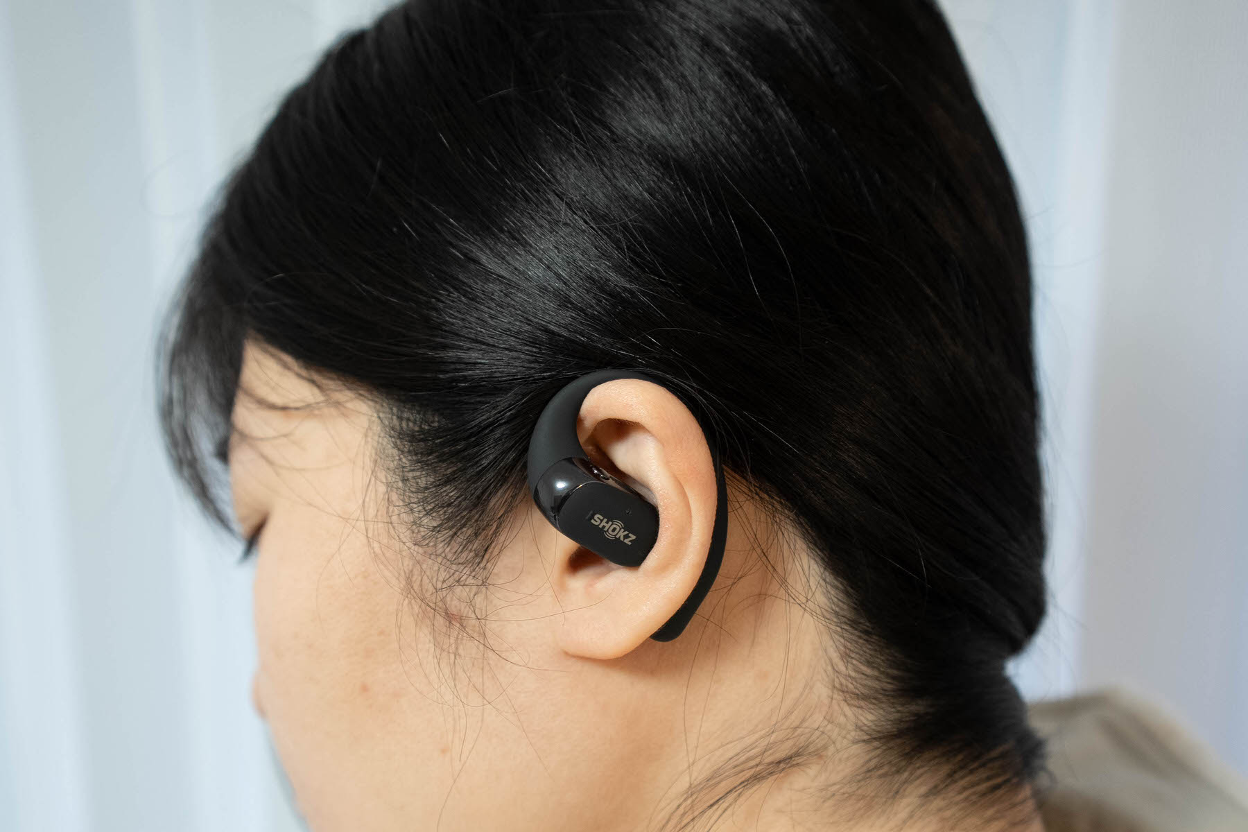 Shokz OpenFit 2 は、イヤーフックで耳に上から引っ掛けるようにして装着する。