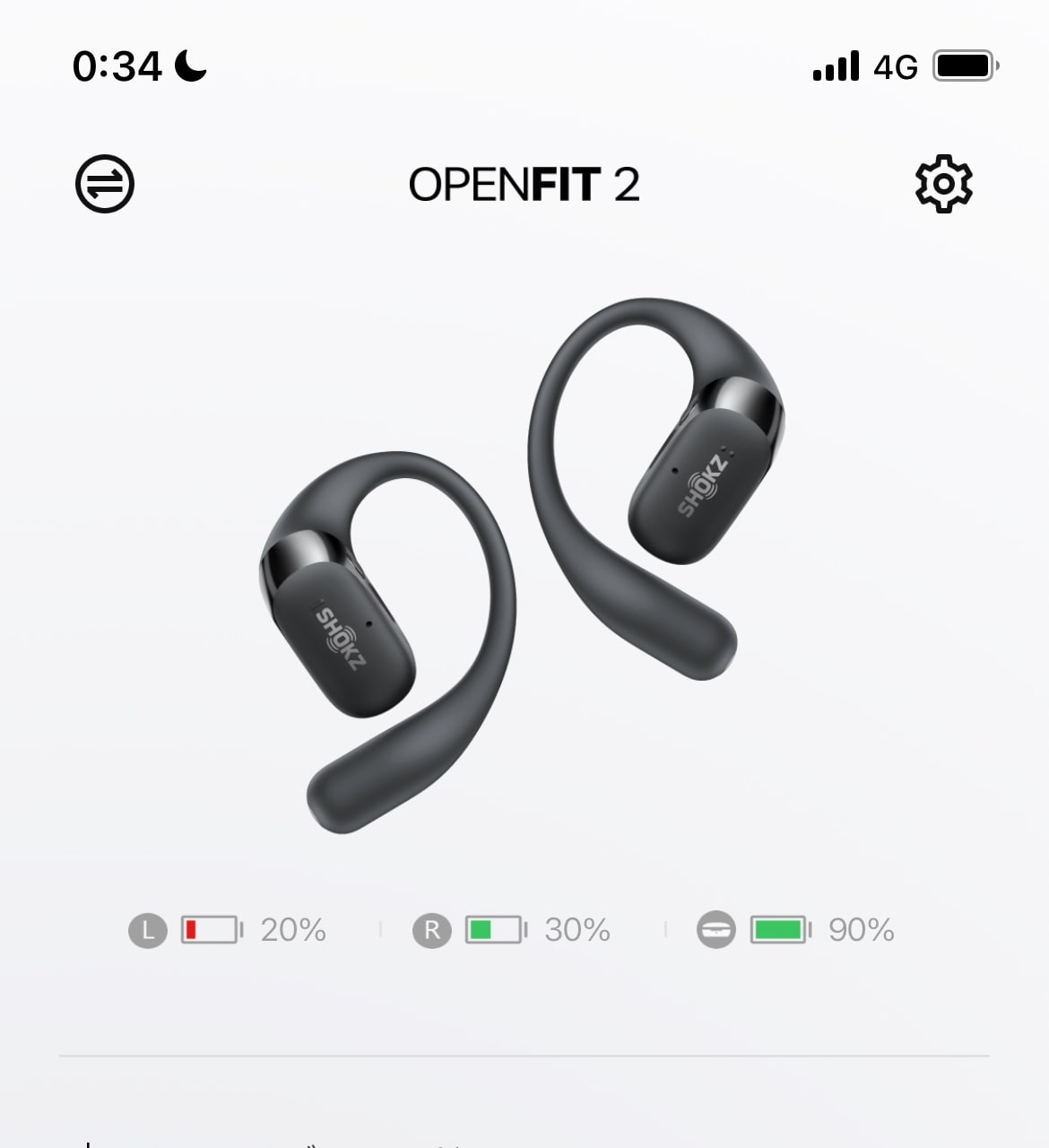 左右イヤホンのバッテリー残量をShokzのアプリから確認してみると、左20%、右30%と表示された。