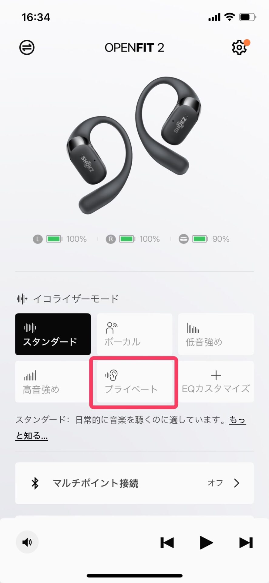 また、さらに音漏れを防ぎたい場合、Shokzのアプリのイコライザーに「プライベート」モードが用意されている。