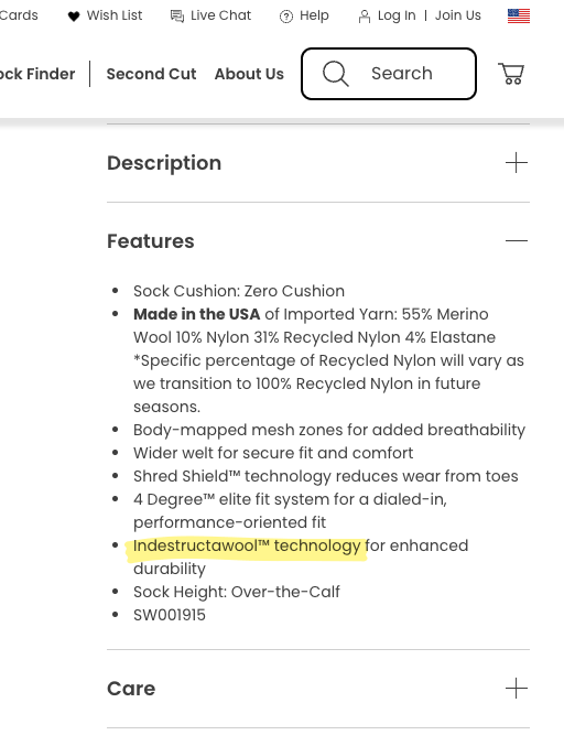 日本で購入する際も、商品概要ページで「Indestructawool」の記載があるか確認すると良い。もし分からなければ、米国Smartwoolの公式サイトで同じモデルを調べ、「Features」欄に「Indestructawool」の記載があるかどうか確認してみよう。