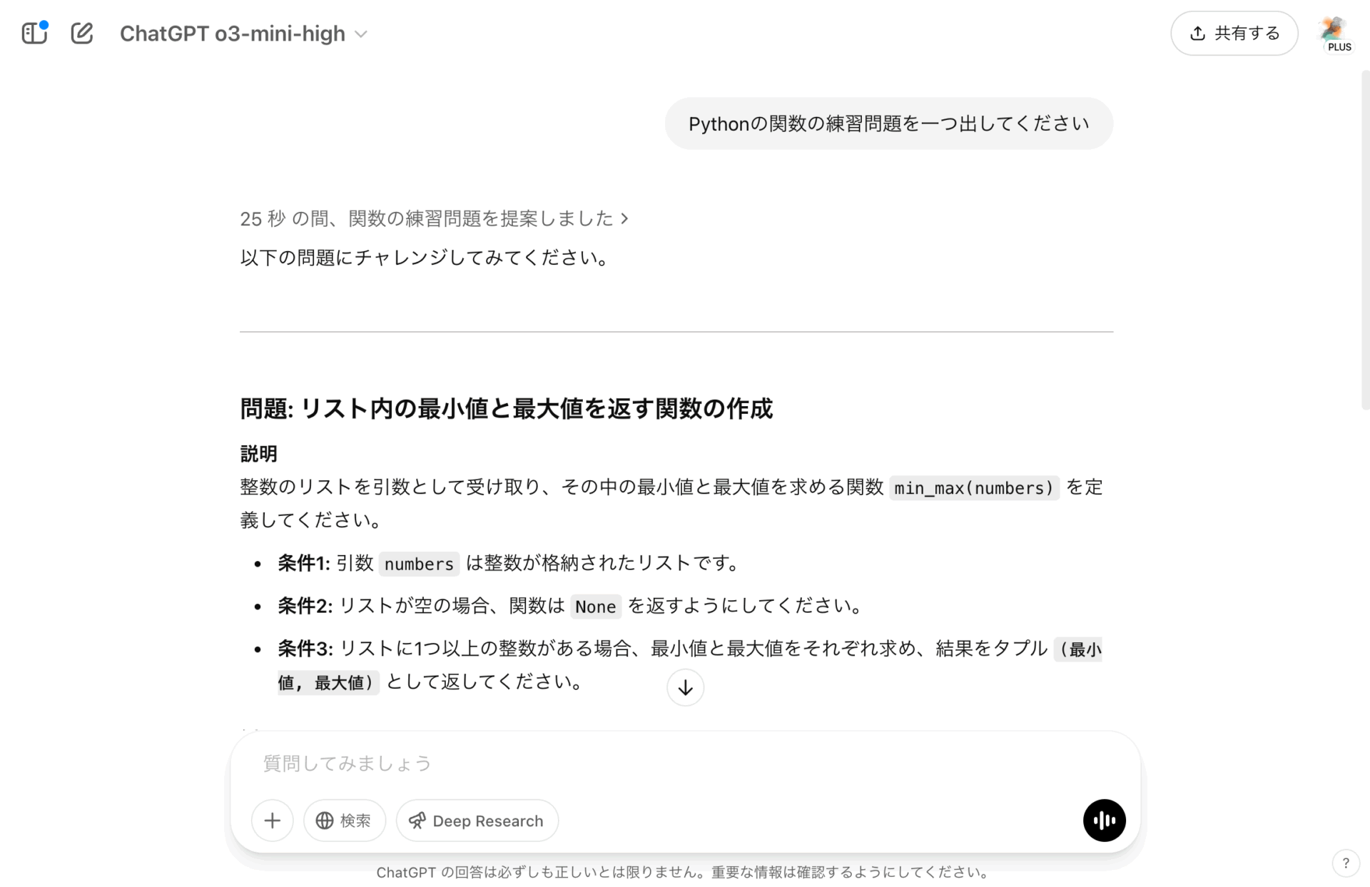 また、独学では練習問題を解く経験を積むのが難しいが、ChatGPTに「Pythonの関数を勉強しています。練習問題を作ってください」などと言えば、練習問題を出してもらえる。