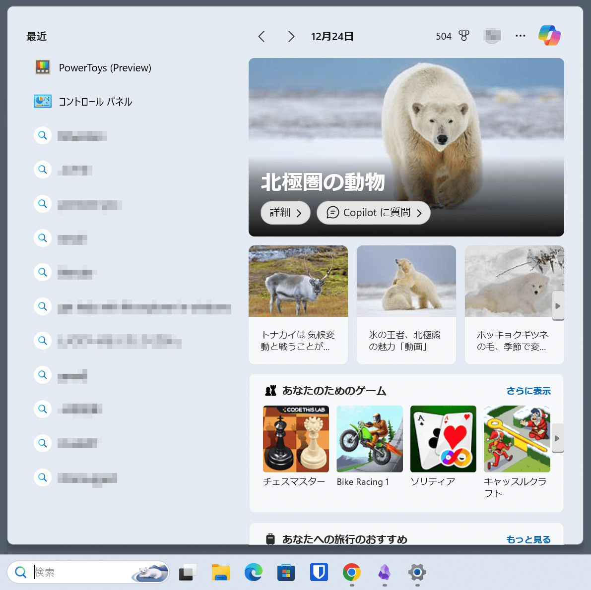 この機能は、タスクバーから呼び出せる検索ウィンドウの右半分に、トレンド検索、記事、ゲーム紹介、Microsoft Rewardsなどの情報を表示するものだ。
