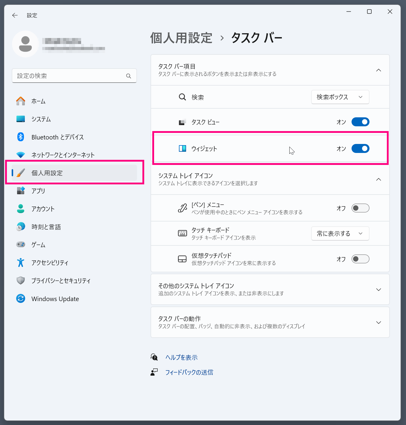- 「ウィジェット」のトグルをオフにする