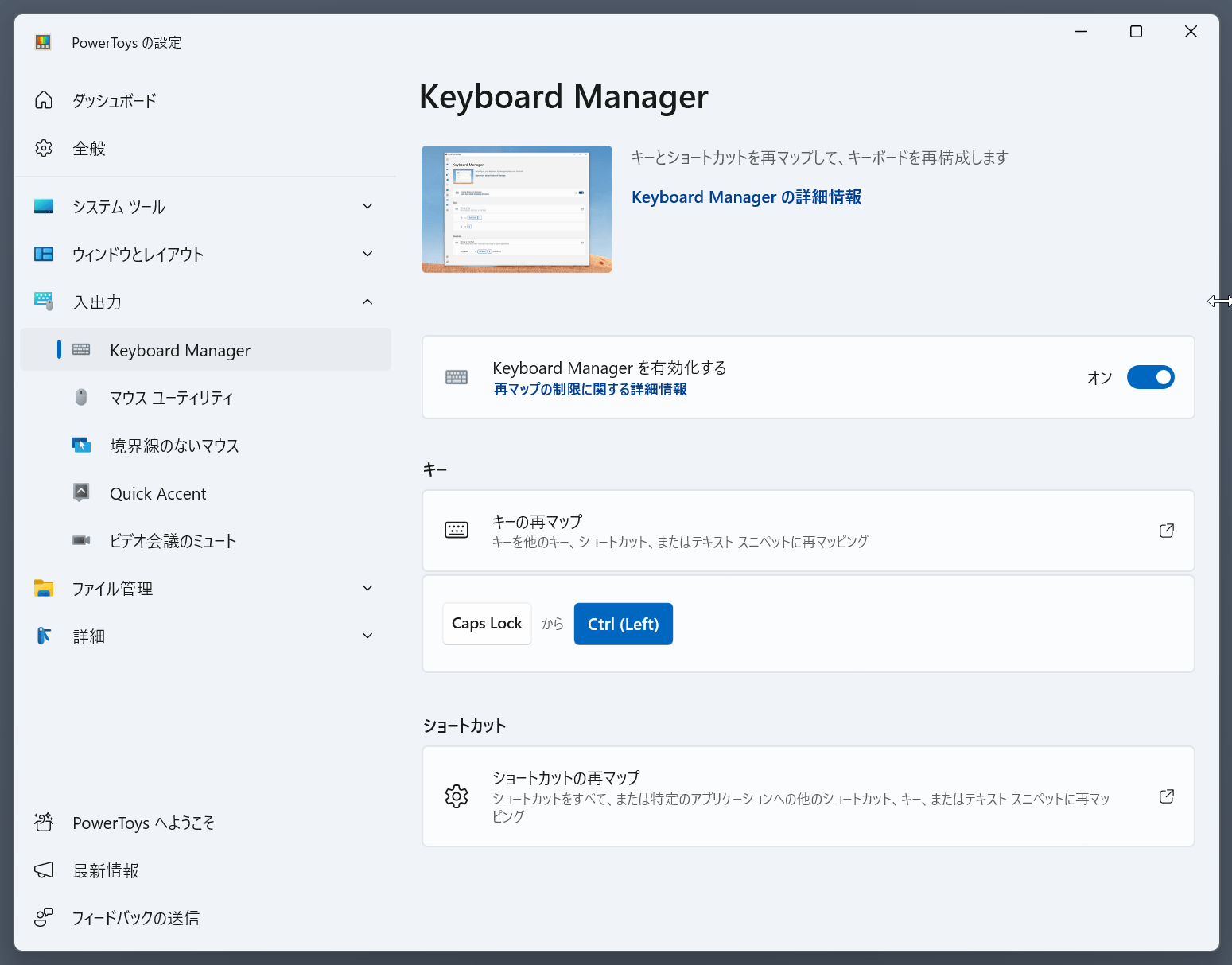 「Keyboard Manager」を有効にすると、キーボードの特定のキーのリマッピングが可能になる。