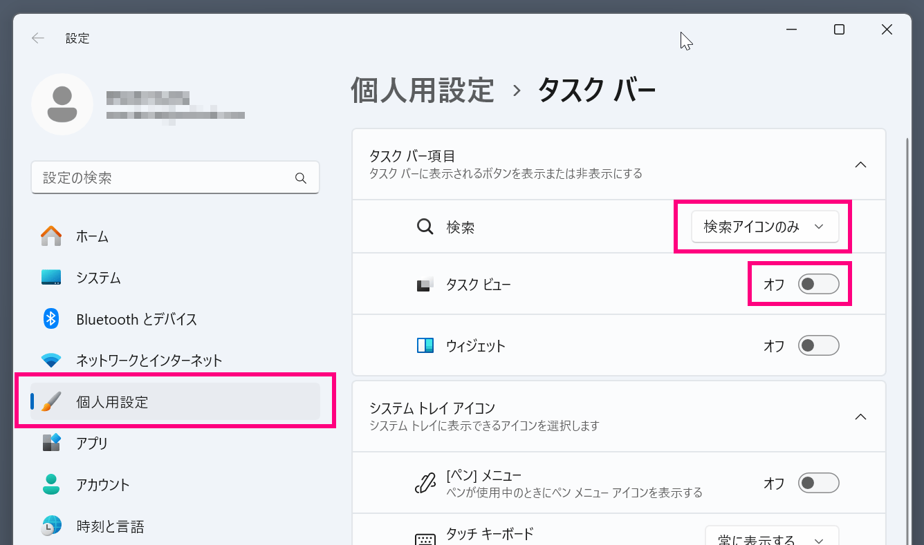 システムアイコンの表示/非表示の設定は、以下の手順で変更できる。
