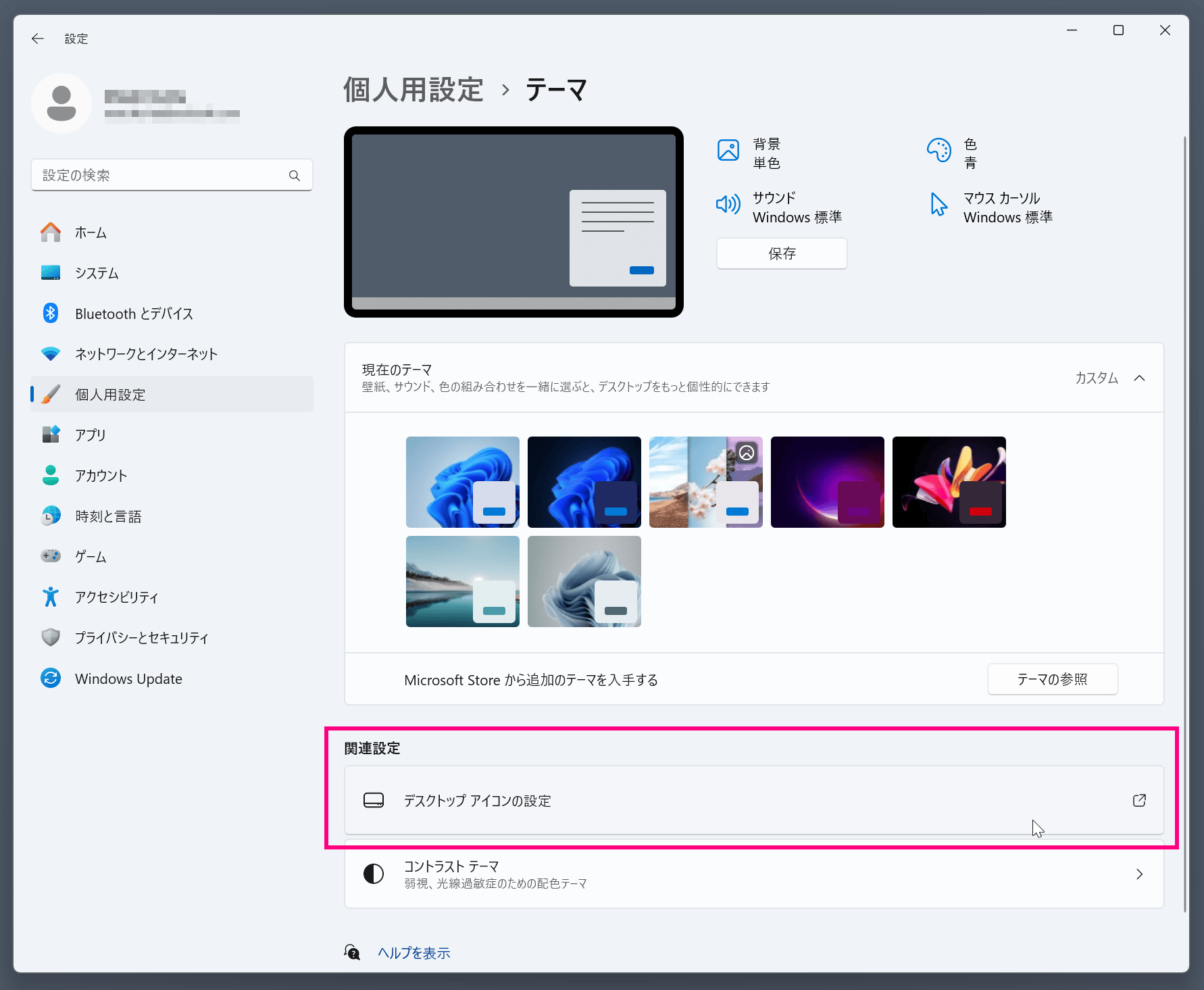 - 「デスクトップアイコンの設定」をクリック