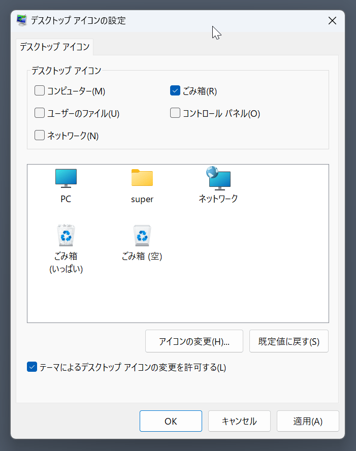 「デスクトップアイコンの設定」で、表示可能なシステムアイコンは以下の5つがある。