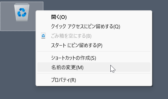 シンプルだが、「ごみ箱」を右クリックして、「名前の変更」で、スペースなどの空白文字を入れておけば、テキストを透明化できるのだ。