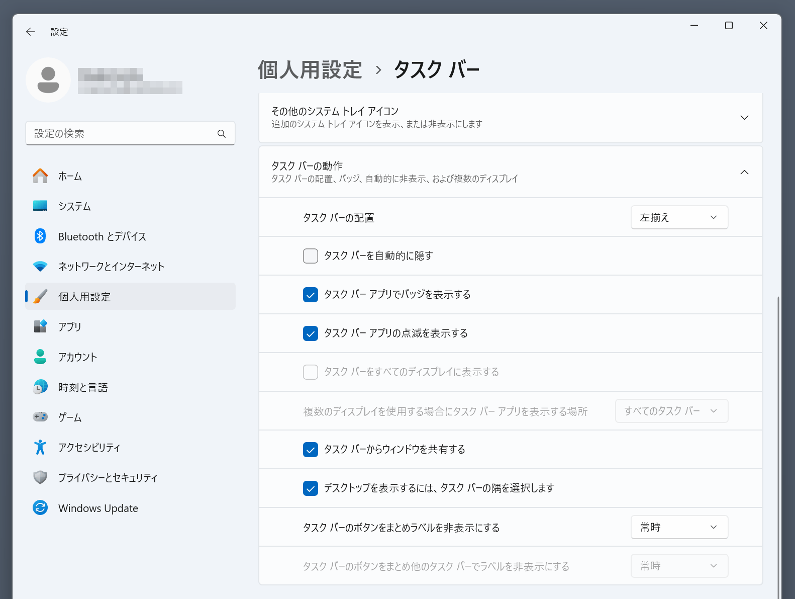 - 「タスクバーの配置」のドロップダウンメニューから、「左揃え」を選択