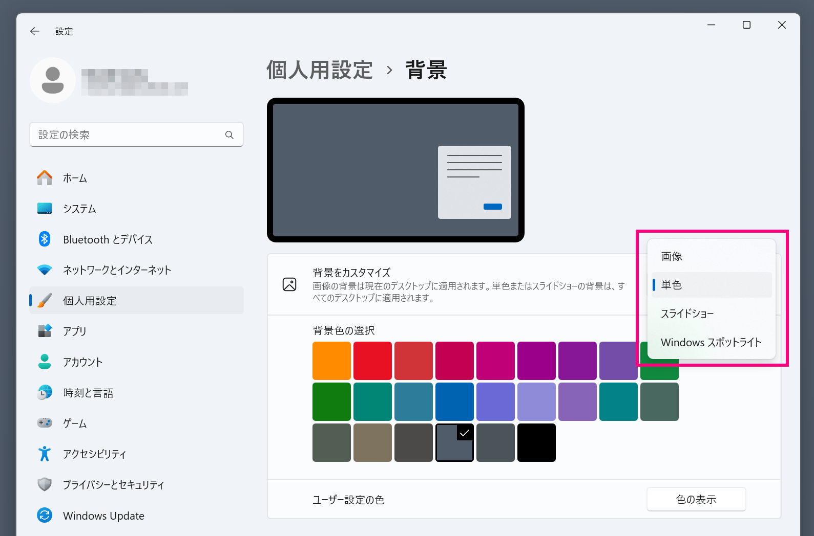 - 「個人用の背景」のドロップダウンメニューから「画像」や「単色」を選択