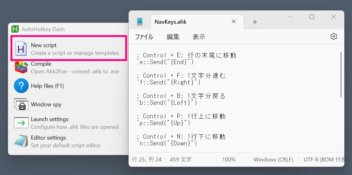 ; ALT + 右矢印 : 行の末尾に移動!Right::Send("{End}")「AutoHotkey」をインストールして、「New script」で新しいテキストファイルを作成し、上記を丸ごとコピペすれば、同じショートカットが利用可能になる。