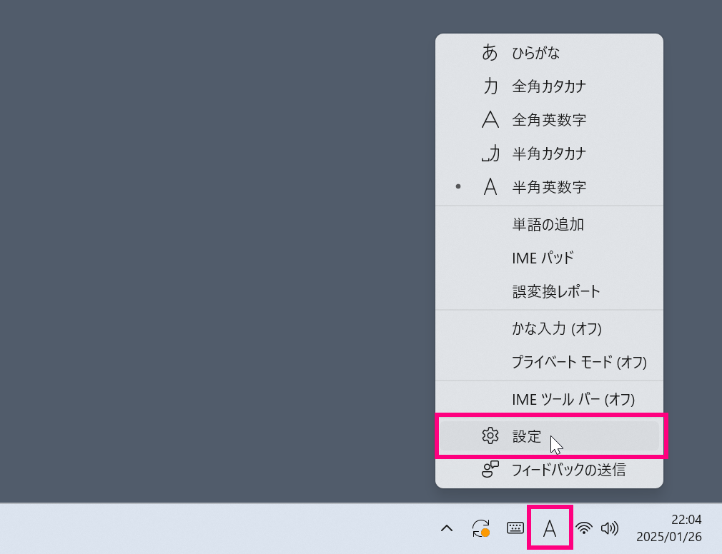 右下のIMEを右クリックして、「設定」を選択する。