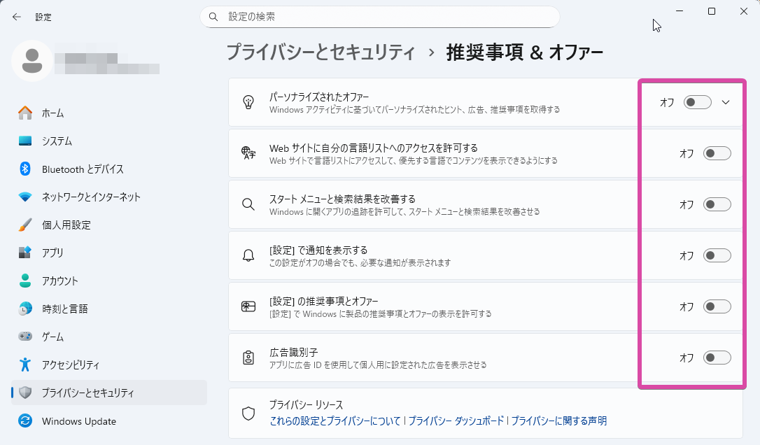 - これらをオフにすることで、Windows全体での広告表示が大幅に抑制される