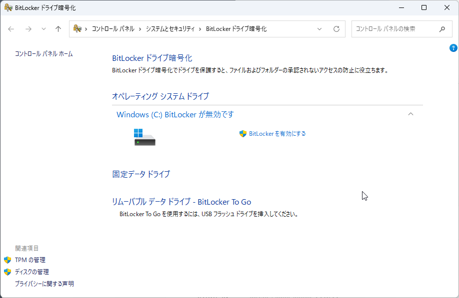 筆者の場合は「Windows 11 Pro」なので、ドライブごとのBitLockerの適用有無を変更できる。