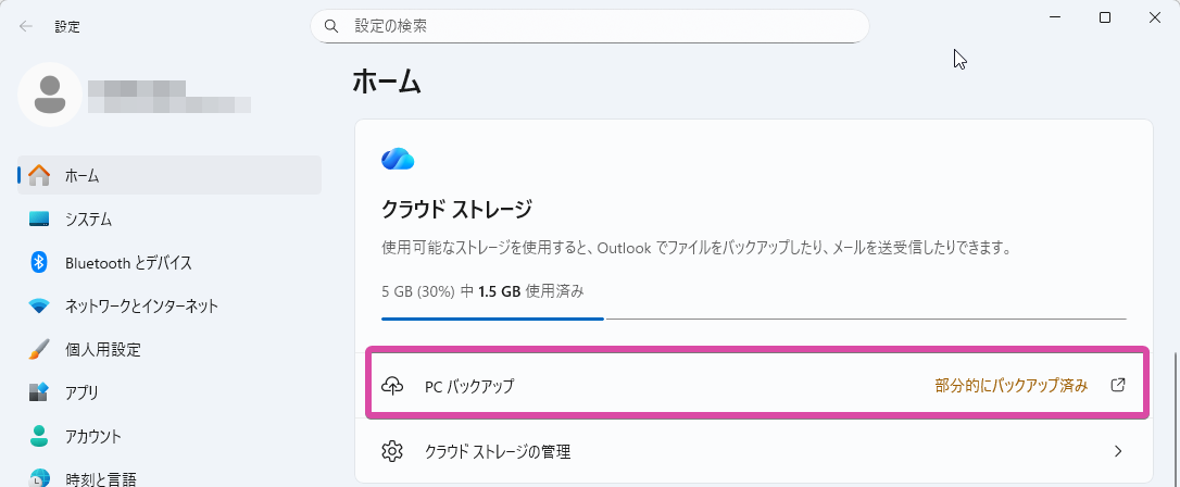 まずは、 設定 > ホーム > クラウドストレージ > PCバックアップ と進んでいき、意図せずOneDriveへのバックアップが行われていないかを調べてみよう。