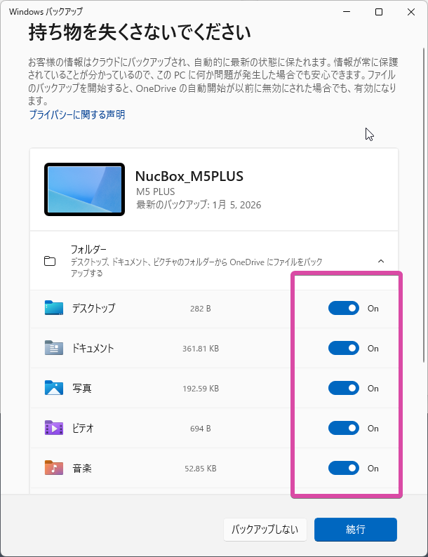 そのため、「PCバックアップ」メニューをクリックして、クラウド(OneDrive)への自動アップロードはオフにしておくことをお勧めする。