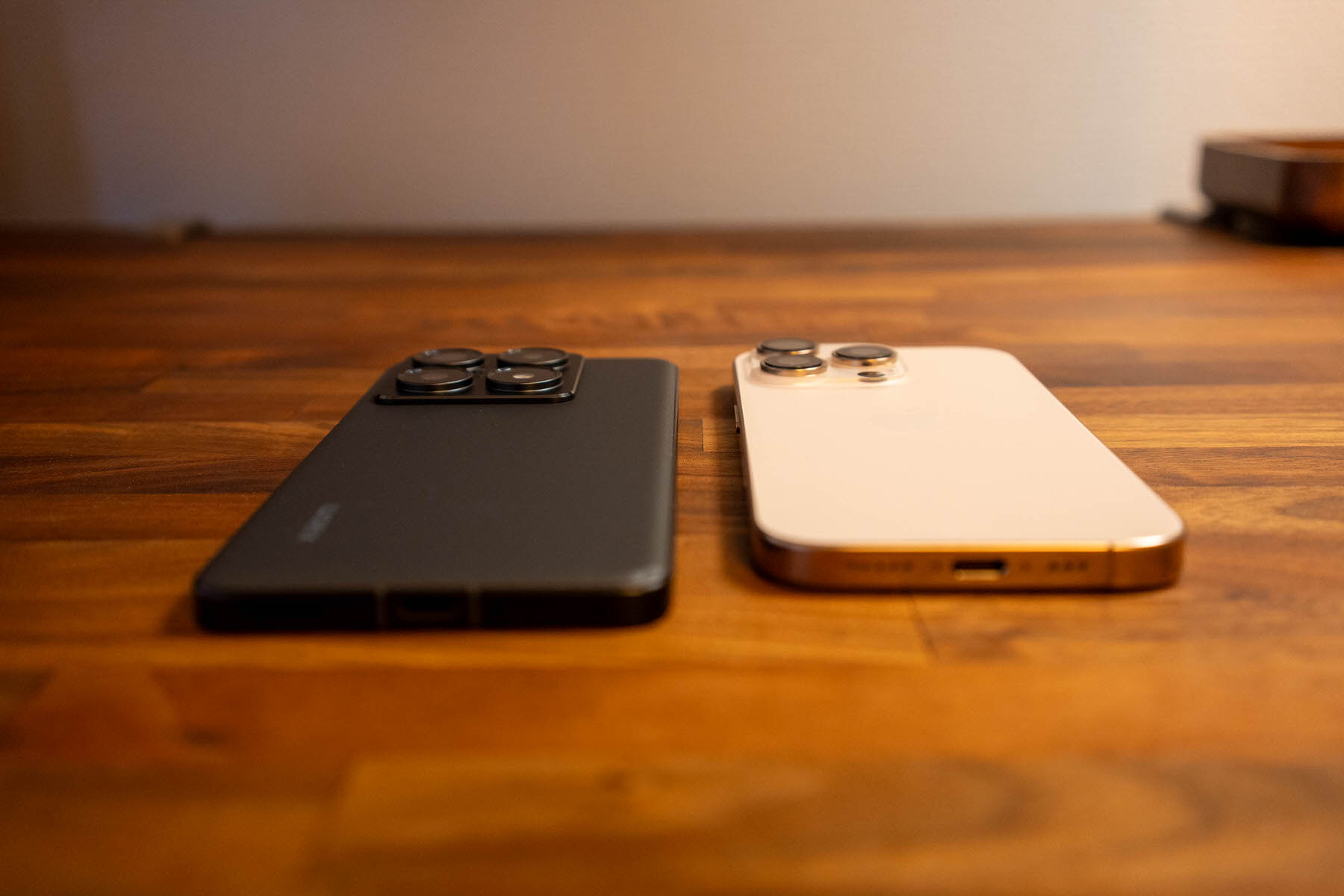 同じく背面カメラが出っ張っているiPhone 16 Pro(右)と、Xiaomi 14T Pro(左)を並べて斜めから見ると、以下のような感じだ。
