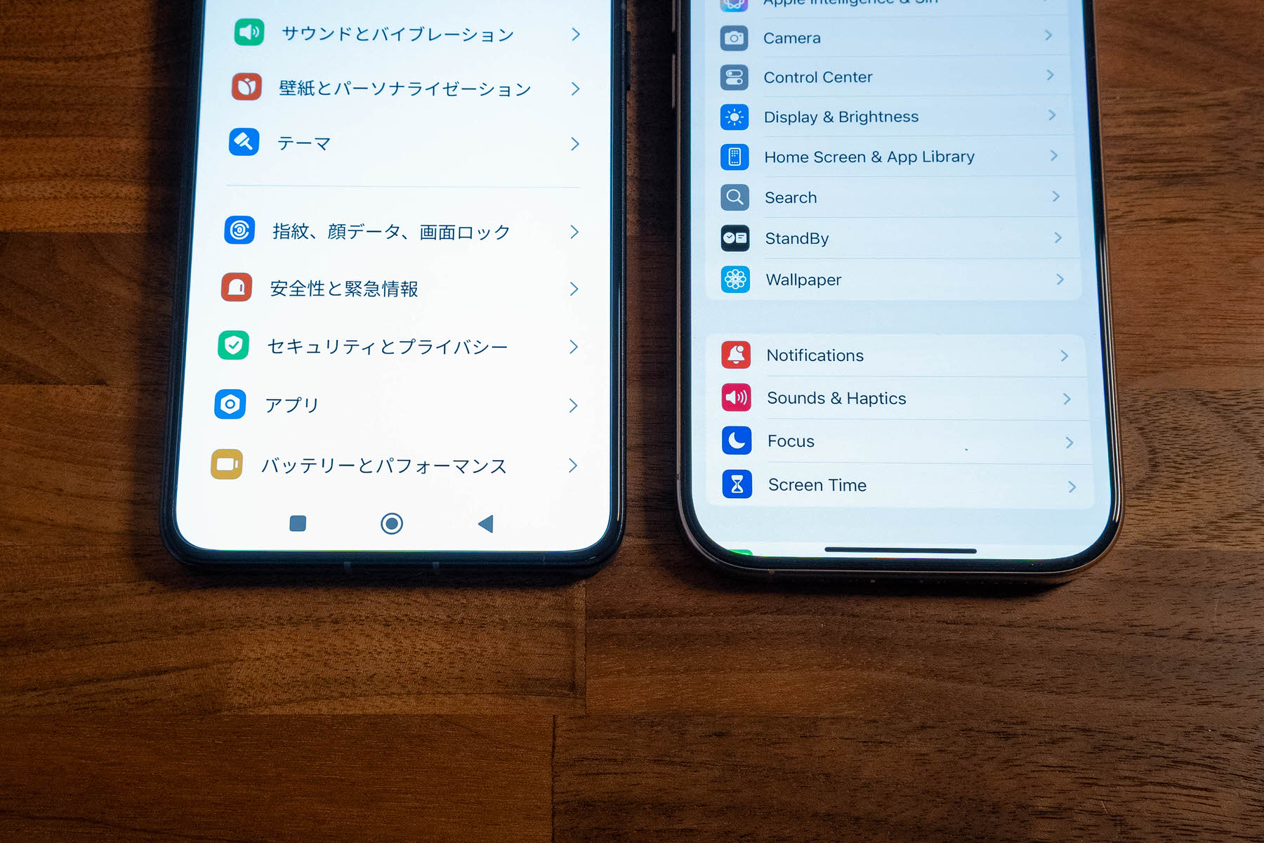 Xiaomi 14T Proが一回り大きい印象だが、重さでいうと209gで、右隣のiPhone 16 Pro(199g)に近く、見た目ほど重くなく軽量である。