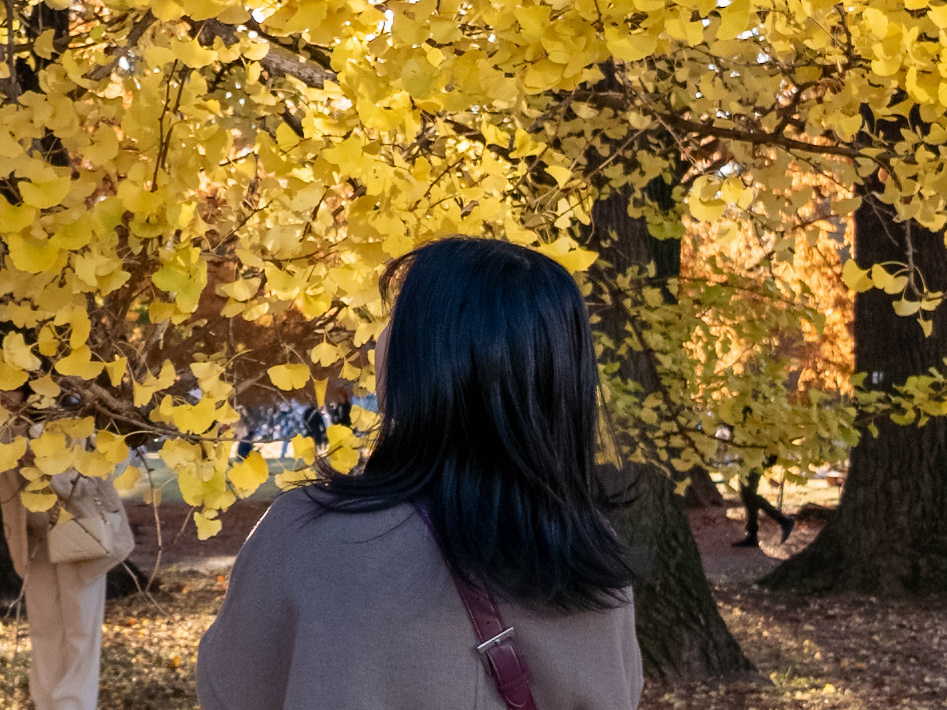 例えば、以下の様に、人物の後ろ姿を引きで撮影した写真をトリミングして、銀杏の葉や、髪の毛をズームアップしてみる。