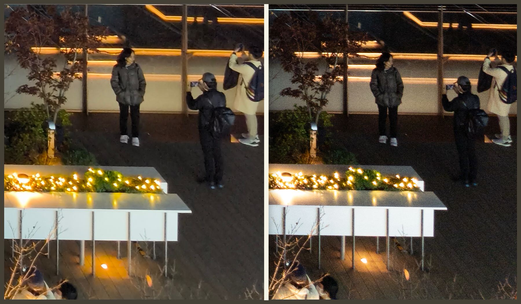 JPEG(左)ではかなりノイズ処理が行われており、灯りや人物の顔が潰れてしまい、少しのっぺりした見た目になっていることがわかる。