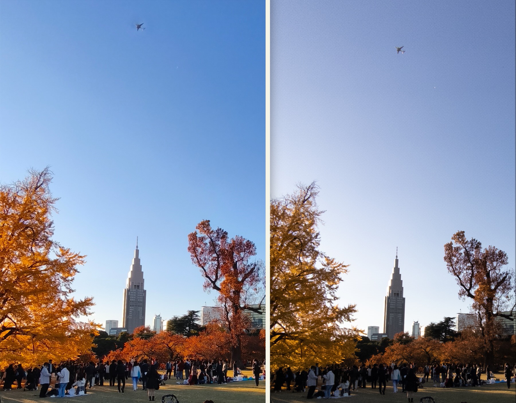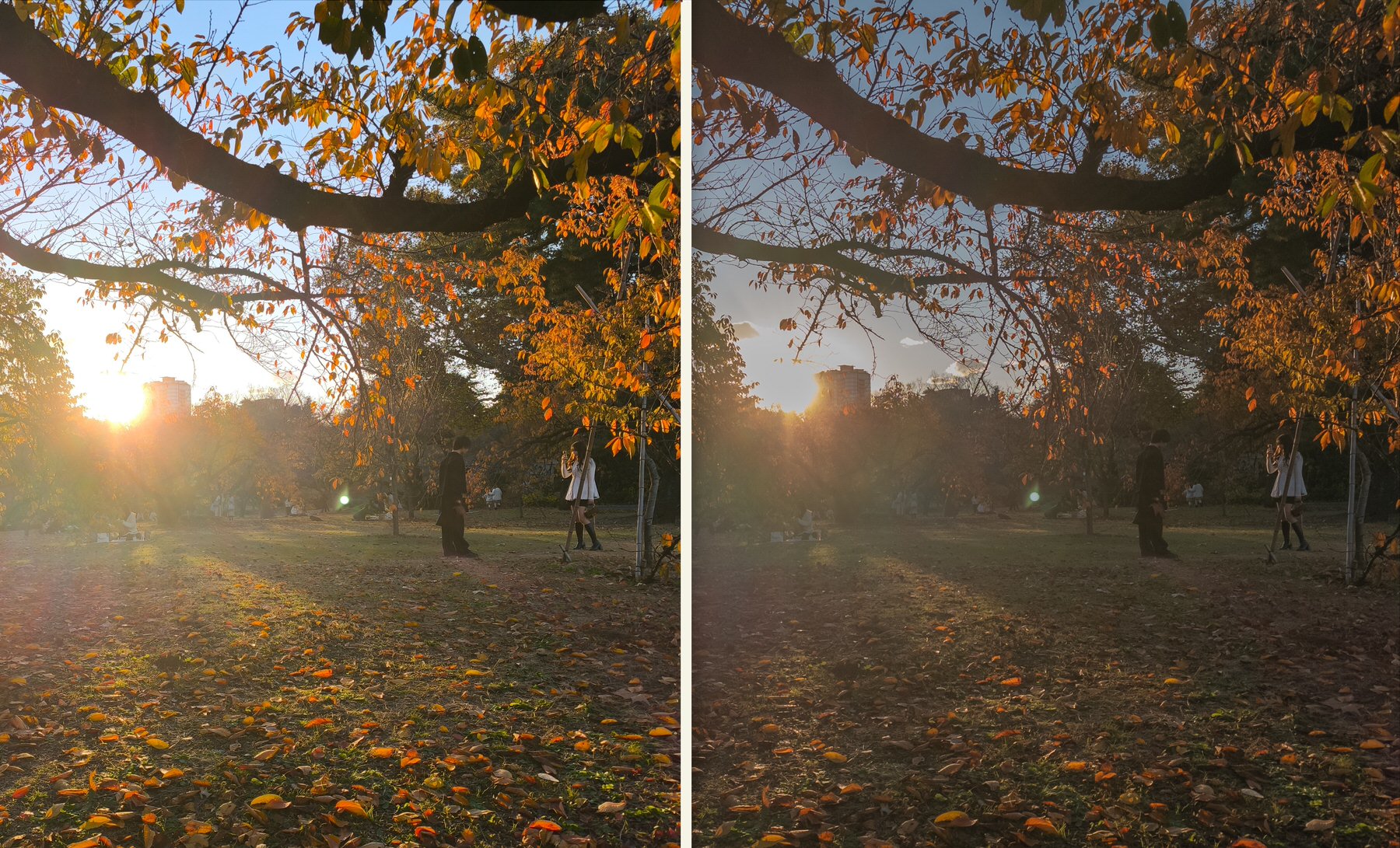 RAW(右)ではノイズ処理がないだけマシだが、やはりメインカメラと比べると描写力が弱く、遠くの木々の葉などは潰れて見えてしまう。