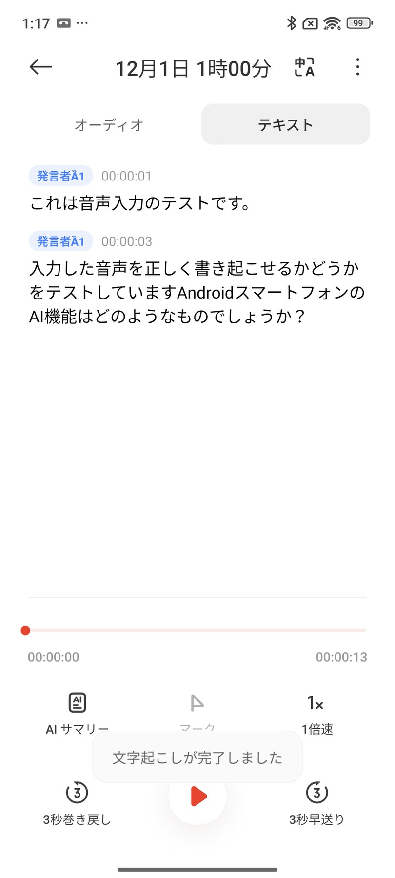 実際に、筆者の声をボイスレコーダーアプリで録音してみると、「テキスト」タブから喋った内容が文字起こしされ、話者、タイムスタンプ、内容が表示された。